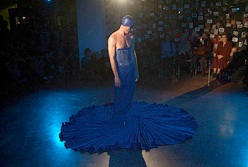 Mennono takes the viewer into a universe of blue, with movements that go back to the tradition of Japanese buto. The image is about physical striving to grasp one's own limits, taking a distance and escaping them – a lecture on processing one's own traumas, finding an own identity and expression in dance. The costume enveloping the body becomes an extension of the dance body that accepts the fact of its boundedness. Energy flowing through the minimal move and in the sign language of the deaf and numb frees the dance soul that with its explosive nature calls the audience to redefine its values.
